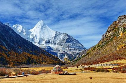 尤其亞丁匯集了稻城秋天所有濃烈的顏色:純凈的藍(lán)天,飛過(guò)白云間的蒼鷹,風(fēng)格獨(dú)特的藏鄉(xiāng)建筑,金黃的秋楊,深紅的沼澤,波光粼粼的小河,多么美的一幅油畫,是人們歸隱田園的夢(mèng)想天堂。
