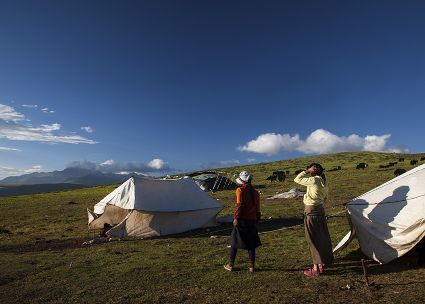 悄然而至的晨曦,隱藏著太古未盡消遁的光芒。揚(yáng)天的旌旗纏成不倒的箭桿,曾經(jīng)的故事還沒走出夢(mèng)中。草原的安謐,輕輕地?fù)嵛恐届o的牛群。奶香已浸漫晨的清新中,擠奶的姑娘臉頰已鍍上了紅霞的光暈。天地間的沉靜,只等待著第一聲牛哞的響起……草原的清晨,朝陽光臨的一刻,酥油和奶汁的淳香會(huì)醉倒那一片草色碧透的天地。