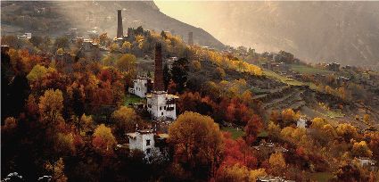 金秋,山寨呈現(xiàn)出一派多彩的畫(huà)面,樹(shù)葉漸次褪綠,漸染紅色,山頂是皚皚白雪,將田園牧歌式的畫(huà)卷展示在人們眼前。