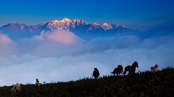 地處瀘定、天全、榮經(jīng)三縣交界的二郎山紅巖頂是與牛背山天然觀景臺隔山相望的又一處云海奇觀觀景臺。這里與牛背山、貢嘎山成崎角遙遙相視;松柏林立、杜鵑滿坡、駿馬閑遛,草甸翠綠;移步亦景,美景誘人,讓人留連忘返,心曠神怡…………