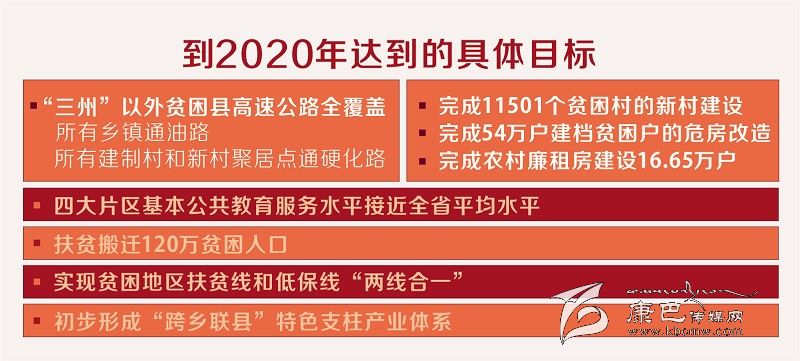 方案提出,到2020年“三州”以外貧困縣高速公路全覆蓋,所有鄉(xiāng)鎮(zhèn)通油路、所有建制村和新村聚居點(diǎn)通硬化路;完成11501個貧困村的新村建設(shè),全面完成54萬戶建檔貧困戶的危房改造,完成農(nóng)村廉租房建設(shè)16.65萬戶;四大片區(qū)基本公共教育服務(wù)水平接近全省平均水平;扶貧搬遷120萬貧困人口;實(shí)現(xiàn)貧困地區(qū)扶貧線和低保線“兩線合一”;初步形成“跨鄉(xiāng)聯(lián)縣”特色支柱產(chǎn)業(yè)體系等多項(xiàng)具體目標(biāo)。最終,確保省委提出的497.65萬農(nóng)村貧困人口全部脫貧、11501個貧困村和88個貧困縣全部“摘帽”,貧困縣農(nóng)民人均純收入比2010年翻一番以上,實(shí)現(xiàn)基本公共服務(wù)均等化、社會保障全覆蓋的目標(biāo)全面實(shí)現(xiàn)。