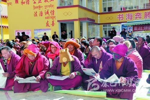 在白玉縣的宣講現(xiàn)場,《甘孜日報》藏文版成了“搶手貨”。
