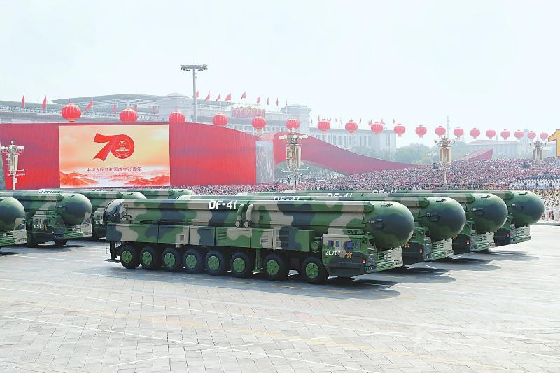 在受閱地面方隊壓軸的戰(zhàn)略打擊模塊中,首次亮相的東風-41核導彈方隊彰顯了我國最先進最具有威懾力大國長劍的重要地位。