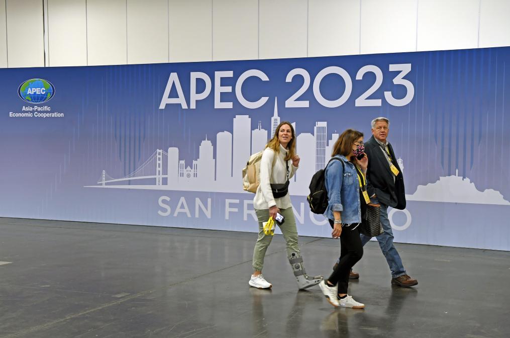 11月12日,在美國(guó)舊金山,記者經(jīng)過(guò)2023年亞太經(jīng)合組織會(huì)議國(guó)際媒體中心內(nèi)的一幅海報(bào)。新華社記者李睿 攝