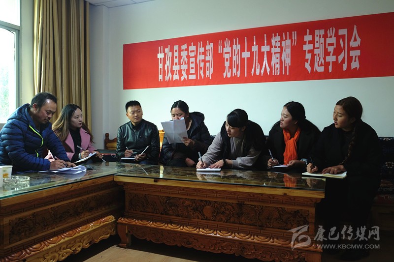 本網(wǎng)訊 (則瑪拉姆 文/圖)連日來,甘孜縣依托中心組、干部講堂、“三級三講”等學(xué)教平臺,圍繞“黨的十九大精神、《中國共產(chǎn)黨章程(修正案)》、習(xí)近平新時代中國特色社會主義思想、決勝全面建成小康社會”四大專題開展學(xué)習(xí),采取專家輔導(dǎo)講、專題研討學(xué)、集中考學(xué)評等形式,迅速組織廣大黨員干部原原本本學(xué)、聯(lián)系實際學(xué)、突出重點學(xué),切實把黨的十九大精神轉(zhuǎn)化為謀劃發(fā)展的思路、促進(jìn)發(fā)展的舉措、領(lǐng)導(dǎo)發(fā)展的能力和推進(jìn)發(fā)展的合力。圖為11月6日下午,縣委宣傳部組織全體職工專題學(xué)習(xí)黨的十九大精神。