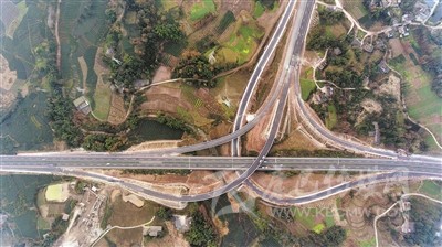 上午11時(shí)許,當(dāng)記者驅(qū)車到達(dá)對巖樞紐互通立交,用無人機(jī)從空中俯拍,這個縱橫交錯、恢弘磅礴的交通樞紐,宛如盤旋在云端的銀龍,又似在大地上延伸的血脈,其造型、規(guī)模、結(jié)構(gòu)都令人嘆為觀止。