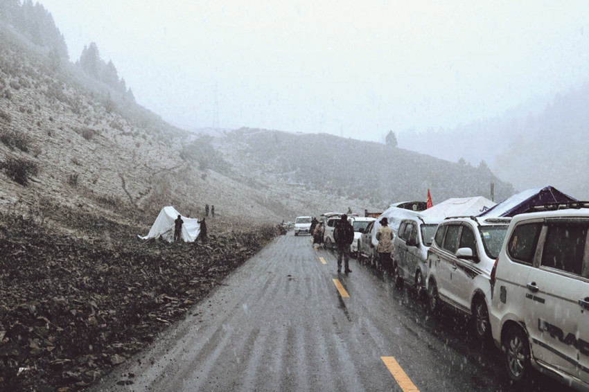 然而,高原的天、娃娃的臉,說變就變。剛剛還艷陽高照的晴好天氣,瞬間寒風(fēng)四起,鵝毛大雪不一會便覆蓋了整個山野。由于到達(dá)蟲草采集點(diǎn)還需4、50分鐘人力轉(zhuǎn)運(yùn)物資,受天氣影響,前行受阻,擔(dān)任護(hù)送任務(wù)的民輔警當(dāng)即幫助群眾搭建臨時(shí)安置點(diǎn),風(fēng)雪中警民互助的身影像極了一家人。一切收拾停當(dāng),盡管風(fēng)寒雪大,條件艱辛,樂觀的群眾和伴隨服務(wù)的民輔警還不忘在風(fēng)雪中來一張合照,他們說,這是歷年來的慣例,每次上山采集蟲草和下山返程,他們都會一個不少地拍張“全家?!?,以此留念蟲草季警民相依的美好記憶。